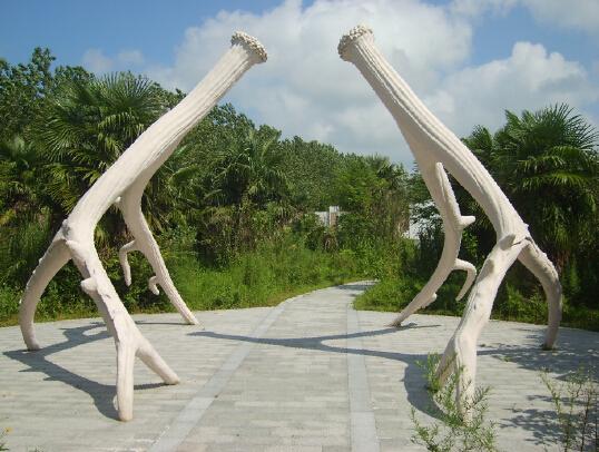 这是麋鹿回归后第一头鹿王角的放大仿制品。麋鹿角的生长和其它鹿种一样,按规律每年脱落一次,就象落叶乔木上的叶片,年复一年地生长凋落。而牛羊类的角一生只长一次,终生不换。在个体之间,从麋鹿角的大小可以判断麋鹿的年龄。角枝的大小和繁殖的成效呈正相关。角枝的作用主要用于同性间的竞争。正常情况下1岁1叉,直至5岁,以后随着年龄的增长长出突瘤。雄麋鹿争偶时主要靠显摆,以及仪式化的格斗,虽不时表现出用角不断相顶的势态,并发出震耳的撞击声,但一般都不会伤及对方的要害部位。这是进化过程中巧妙选择的结果。